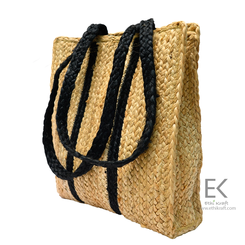 Ethi Kraft Handmade Jute Bag – 100% jute – Square Jute Shopping Bag with Black Stripes